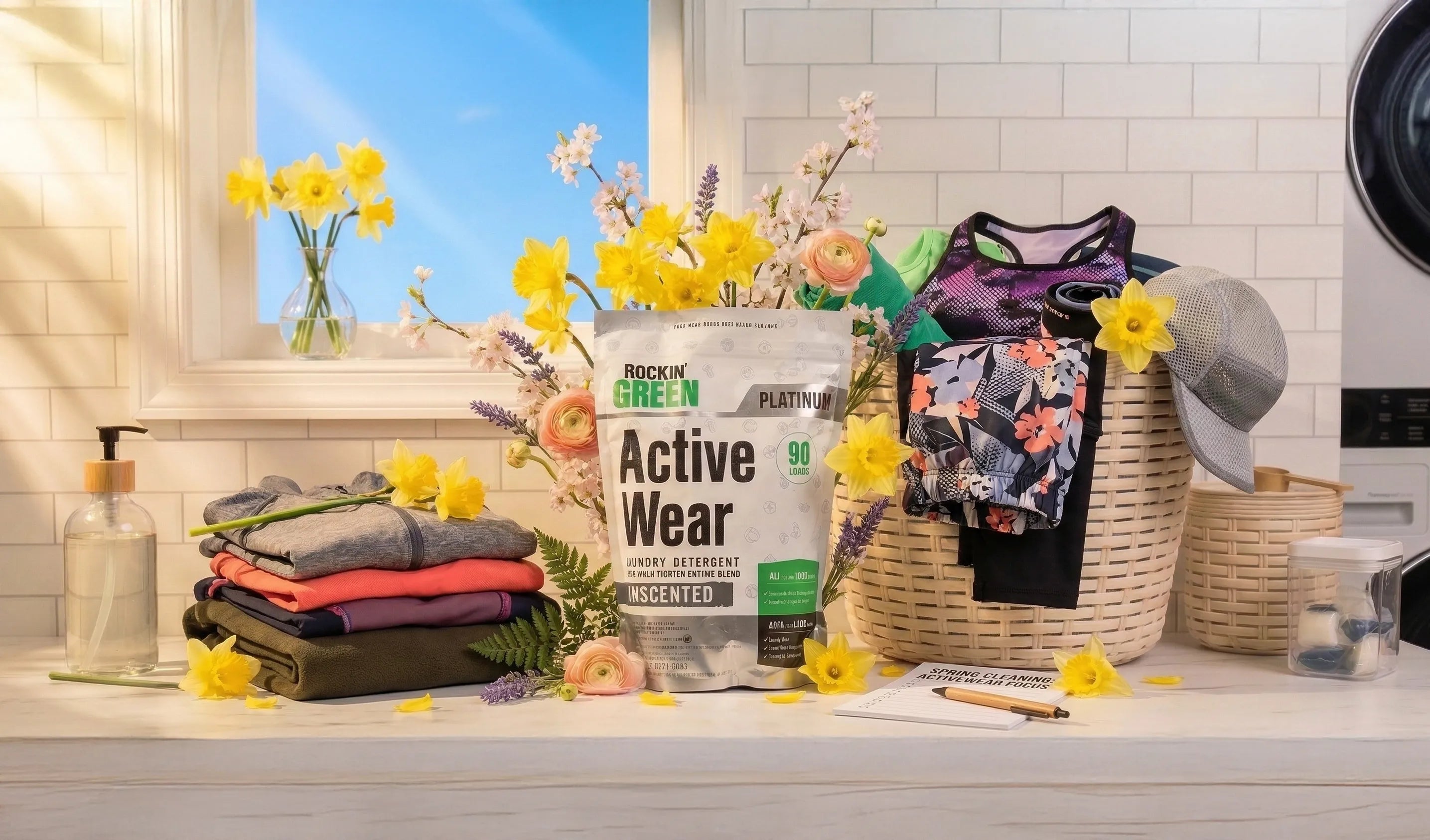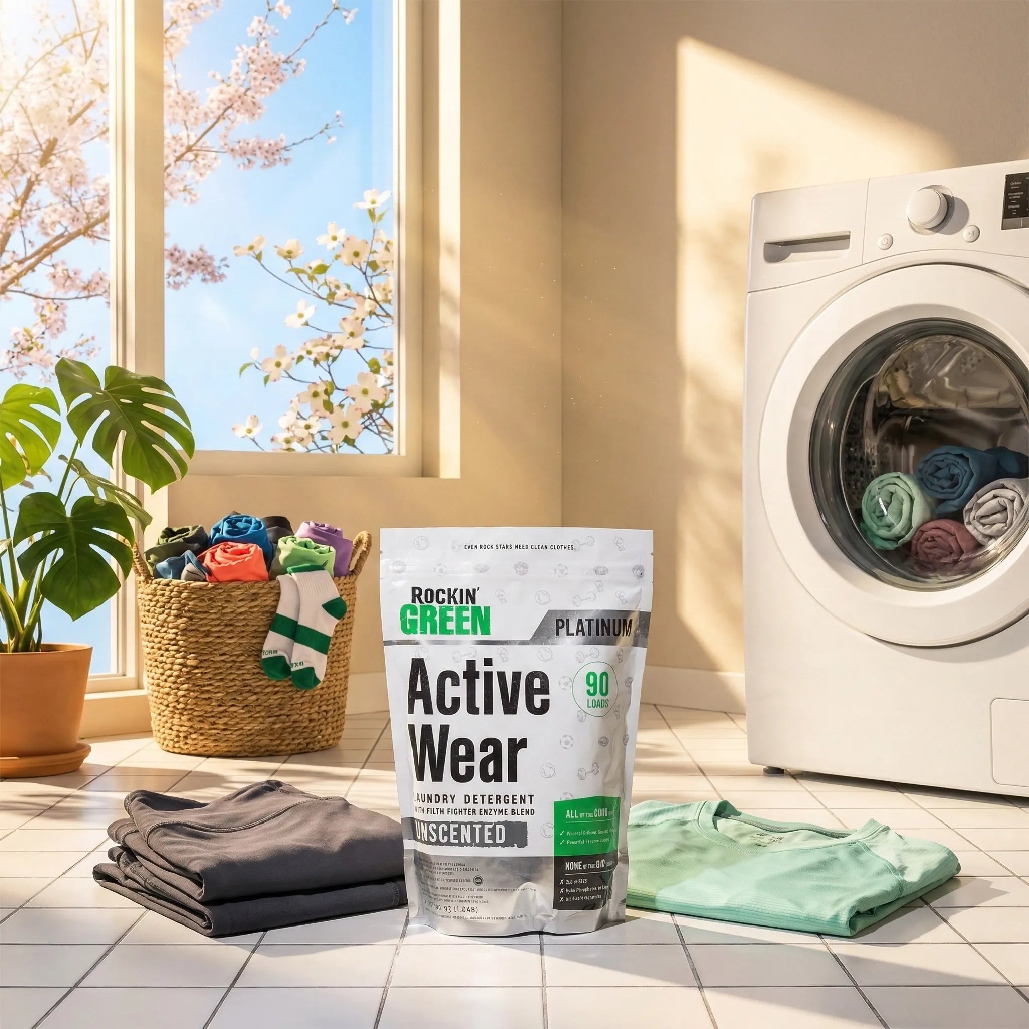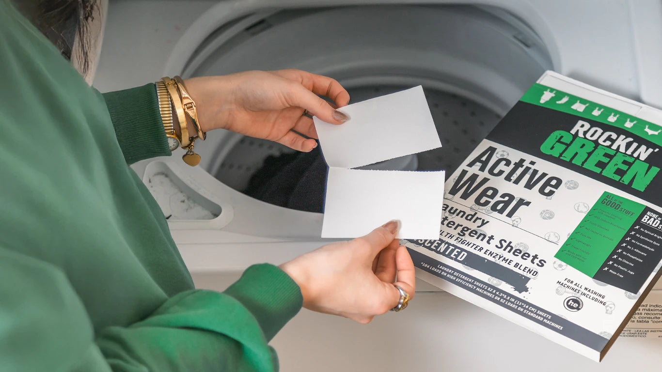 Rockin Green Active Wear Detergent removes sweat, stains, and odors from workout clothes. Safe, eco-friendly, and concentrated for up to 90 loads.